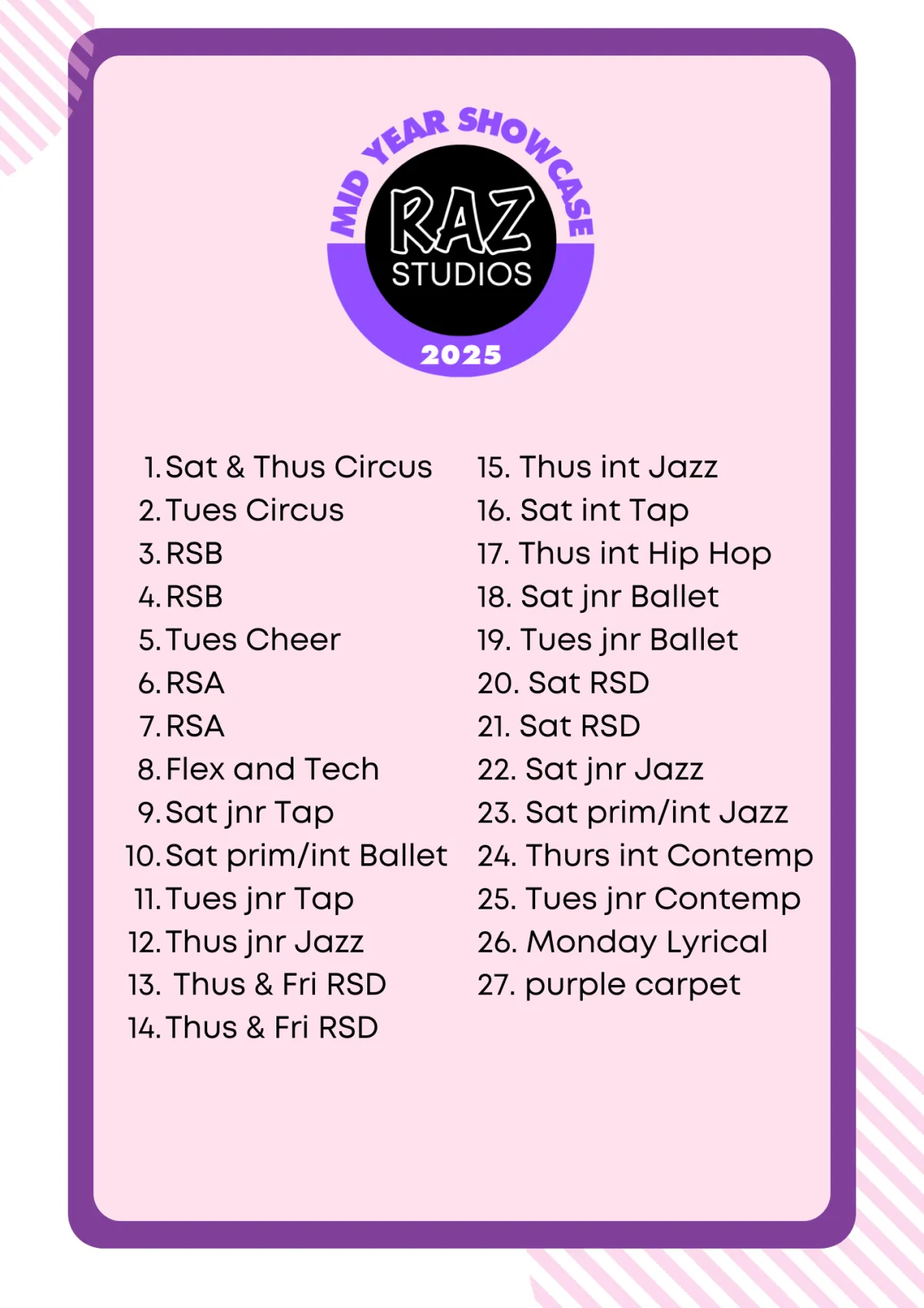 Please check the running order below so that you know what shoes your child is required to arrive in.